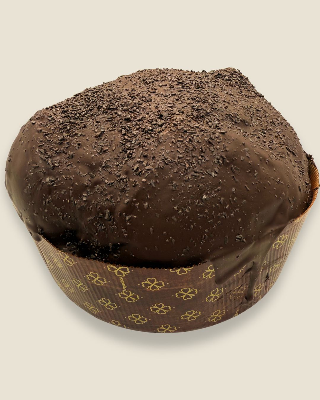 Delizioso Panettone al Cioccolato ricoperto di glassa al cioccolato e granella di cioccolato.